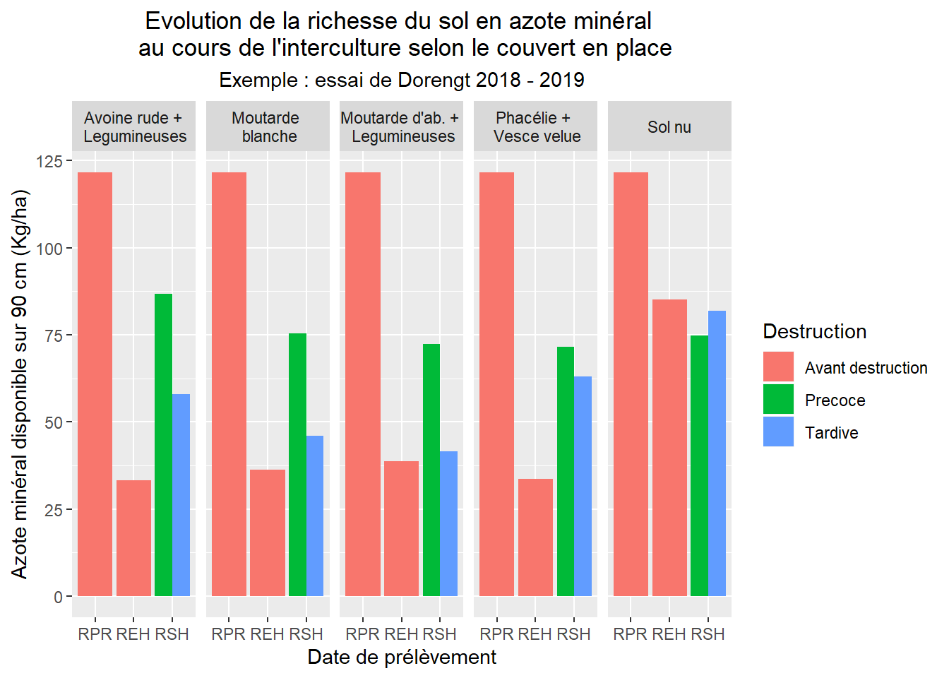 Quelle que soit le couvert présent, la disponibilité en azote augmente entre l’entrée et la sortie d’hiver. Dans cet essai (Dorengt 2018-2019), la disponibilité en azote minéral est forte juste après la récolte du précédent. Le couvert joue alors son rôle de piège à nitrate même dans les modalités riches en légumineuses (plus de 80 %) en réduisant le stock d’azote minéral en entrée d’hiver. Durant l’hiver, le sol à tendance à s’enrichir en azote sous les modalités couvertes pour rattraper le sol nu en sortie d’hiver. Cette dynamique est vérifiée surtout pour les couverts détruits et incorporés en entrée d’hiver qui commencent plus tôt leur minéralisation. Ainsi le retard de destruction des couverts retarde leur minéralisation et induit des reliquats entrée d’hiver plus faibles.